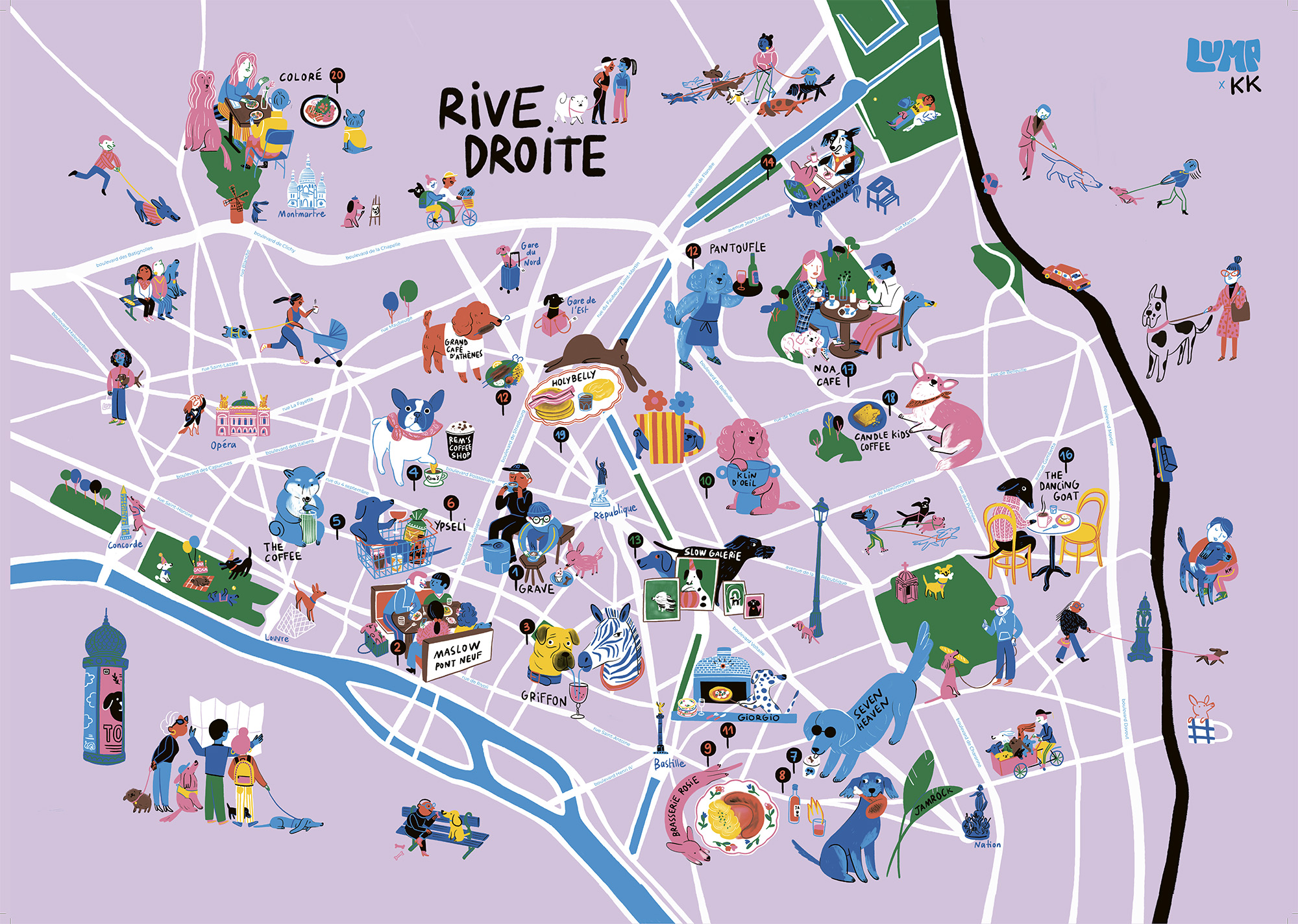 Camille De Cussac is a young Parisian illustrator, particularly fond of animals and who loves putting colour everywhere, especially in most unexpected places: her world is a joyous version of ours where expressive animals, characters with purple skin and teal hair, eccentric musicians, harmonious natural and urban landscapes fill the space. And Camille writes as well as she draws – some of her merry and educational children’s books published at Gallimard, Thierry Magnier, Seuil, Marcel & Joachim, and Éditions du Trésor have been written, as well as illustrated, by her hand.